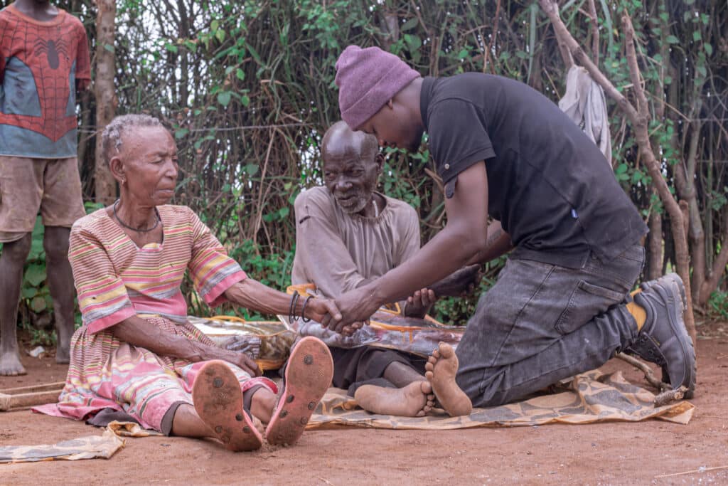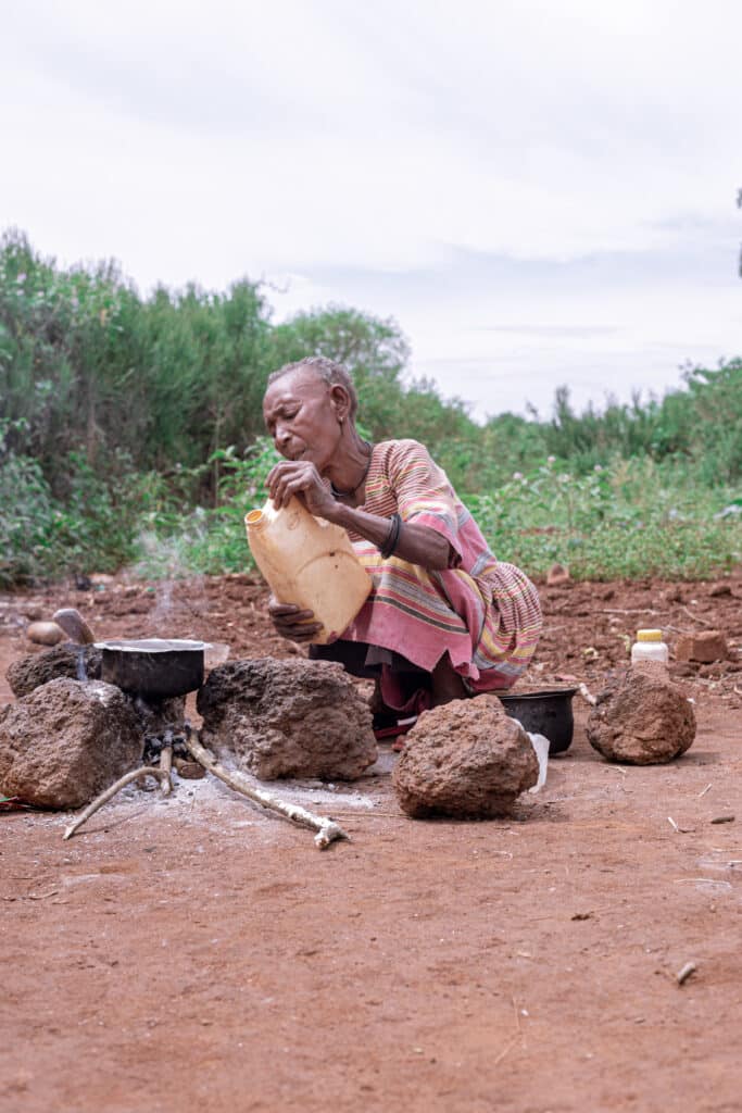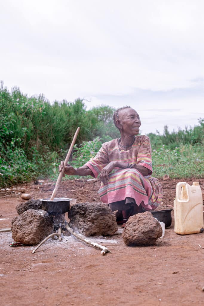 When we arrived, we found Maggie in an open space outside their small grass-thatched, mud-walled home, preparing what could hardly be called a meal just water set on fire, a painful symbol of hunger and lack. Nearby, Odibala sat quietly, seated on his walking stick, watching his wife with eyes that had seen many hard years. It was clear they had grown used to such days, expecting nothing, surviving one moment at a time.