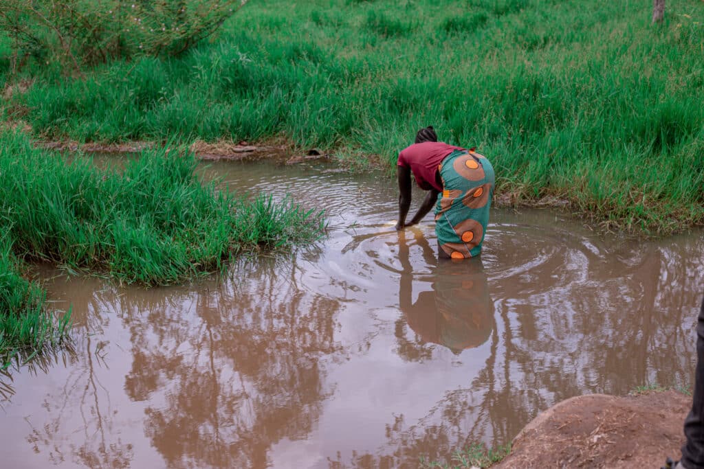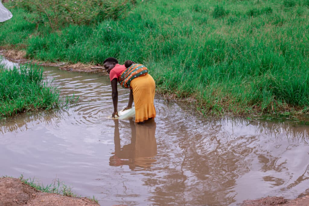 A woman carrying a baby at he back while collecting water from the pond.